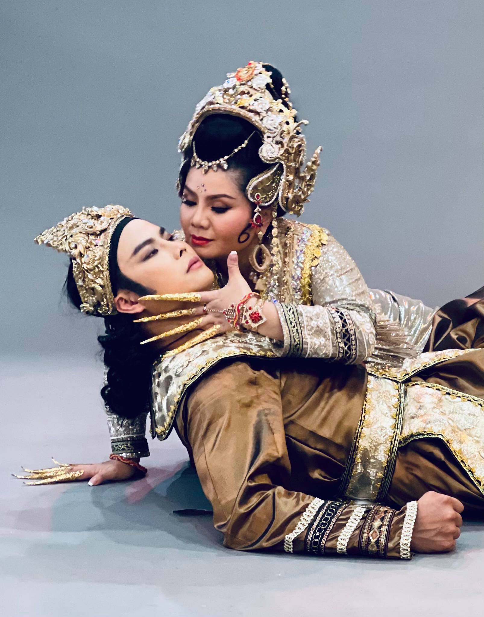 Võ Minh Lâm (vai vua Priêm) và Tú Sương trong vai Nữ quỷ - một vai mà theo đạo diễn Hoa Hạ, Tú Sương đã lùi lại để giúp các bạn trẻ thăng hoa, vai chỉ có một cảnh nhưng chứng tỏ sự đa dạng trong khả năng của Tú Sương - Ảnh: TRẦN ANH KHOA